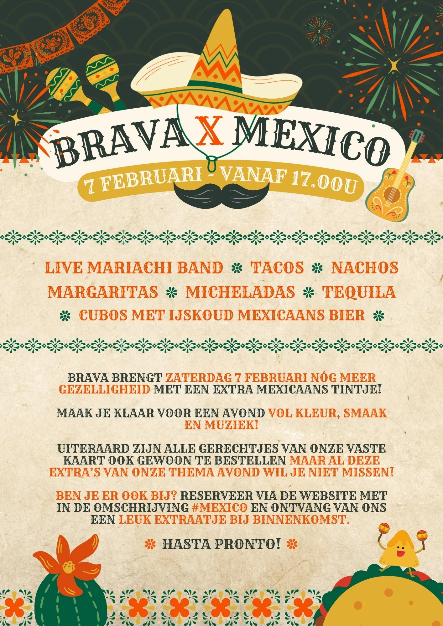 Zaterdag 7 februari vanaf 17.00 uur proeven we de smaken van Mexico! Maak je klaar voor een avond vol kleur, smaak en muziek! Naast de gerechtjes van onze vaste kaart hebben we heerlijke taco’s, nachos, margaritas, micheladas en natuurlijk mag tequila en ijskoud Mexicaans bier niet ontbreken!